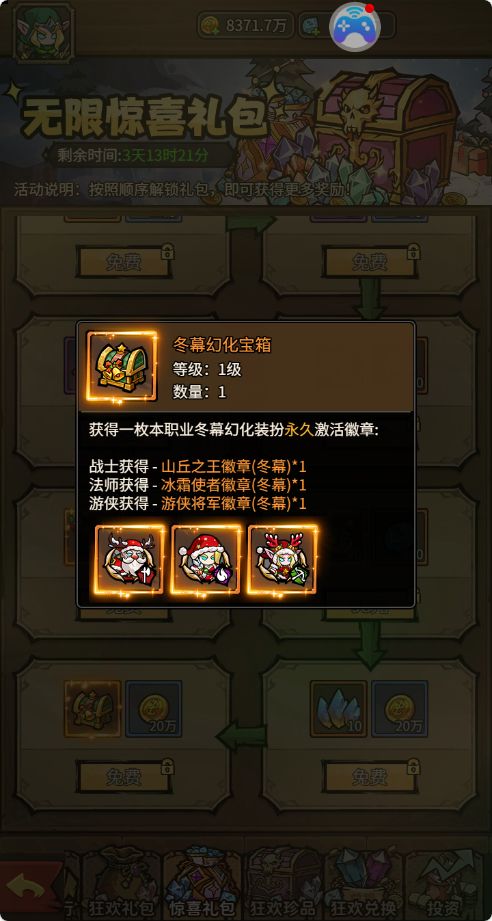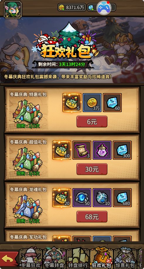 活动期间,一般会售卖主角皮肤或者随从碎片等,超值惊喜,16个礼包档位,高倍价值礼包。