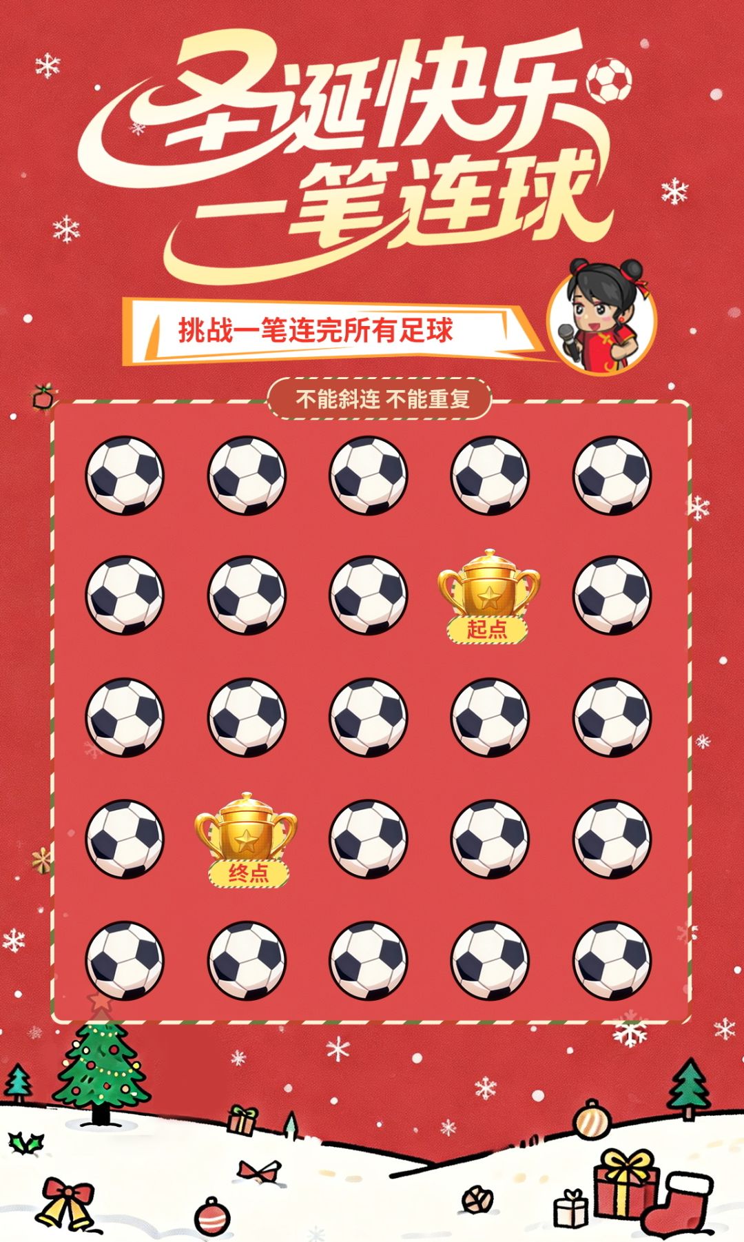 1、查看以上圣诞连线图,尝试从起点一笔画到终点,同时需要挑战一笔连完所有足球,不能斜连,不能重复哦;