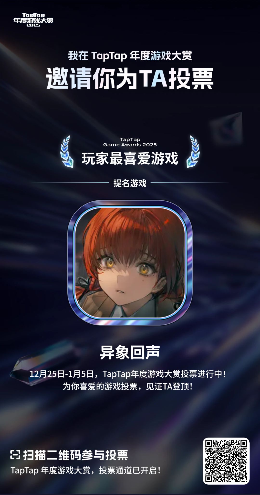异象回声入选2025 TapTap 年度游戏大赏「玩家最喜爱游戏」!