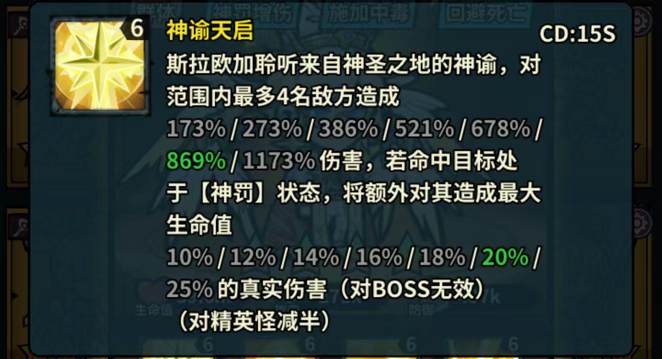 斯拉欧加聆听来自神圣之地的神谕,对范围内最多4名敌方 造成173%/273%/386%/521%/678%/869%/1173%伤害,若命中目标处于【神罚】状态,将额外对其造成最大生命值10%/12%/14%/16%/18%/20%/25%的真实伤害(对BOSS无效) (对精英怪减半)