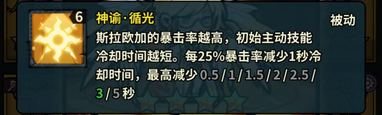 斯拉欧加的暴击率越高,初始主动技能冷却时间越短 。每25%暴击率减少1秒冷却时间,最高减少0.5/1/1.5/2/2.5/3/5秒
