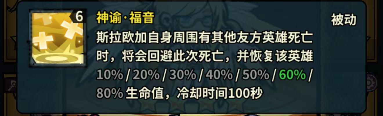 斯拉欧加自身周围有其他友方英雄死亡时,将会回避此次死亡,并恢复该英雄10%/20%/30%/40%/50%/60%/80%生命值,冷却时间100秒
