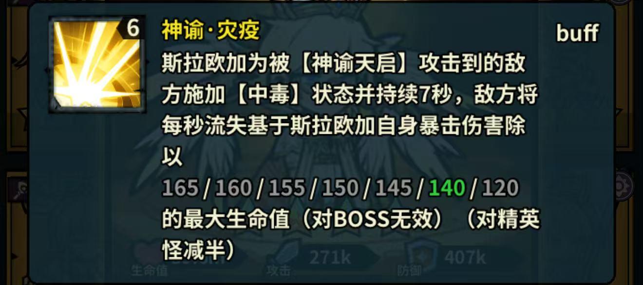 斯拉欧加为被【神谕天启】攻击到的敌方施加【中毒】状态并持续7秒,敌方将每秒流失 基于斯拉欧加自身暴击伤害除以165/160/155/150/145/140/120的最大生命值(对BOSS无效)(对精英怪减半)