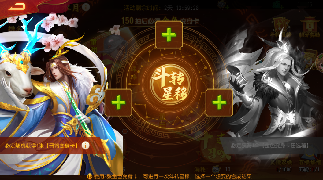 2、主公进行斗转星移,可以自选一个结果,选择获得一张随机晋将变身卡,或者获得一个金色变身卡任选箱。