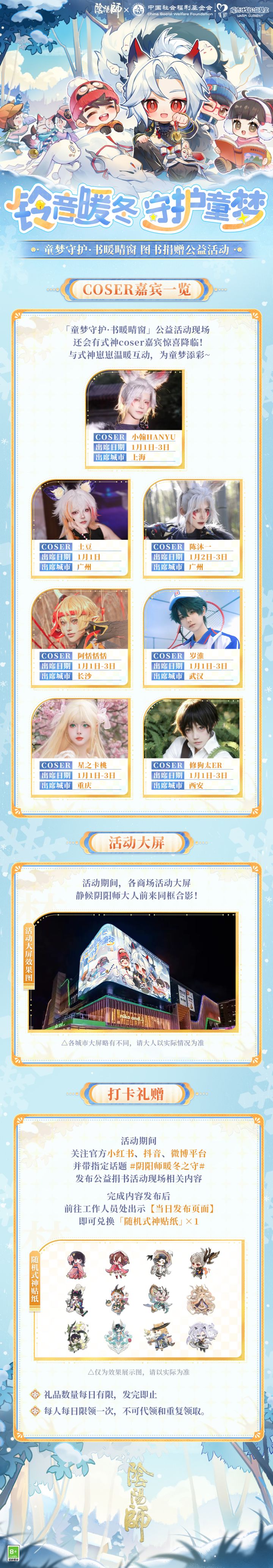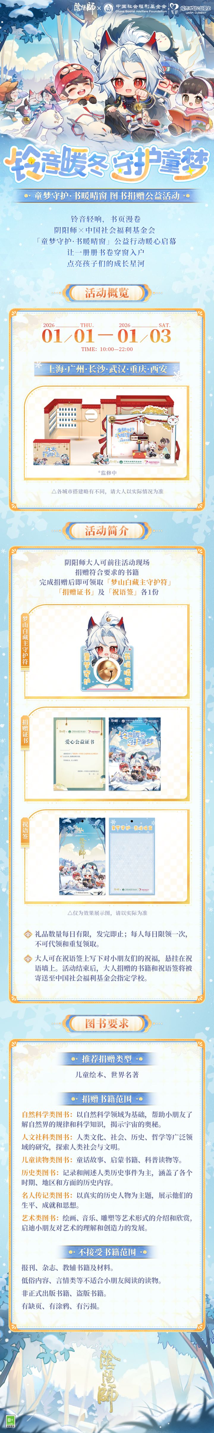 以书为舟,载梦起航。阴阳师 × 中国社会福利基金会 暖流计划「童梦守护·书暖晴窗」图书捐赠公益活动2026年1月1日-1月3日开启,将守护的力量汇入书卷,化作一份触手可及的陪伴,送到孩子们身边!