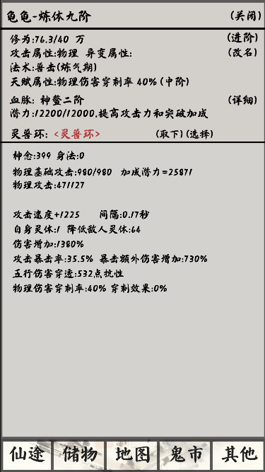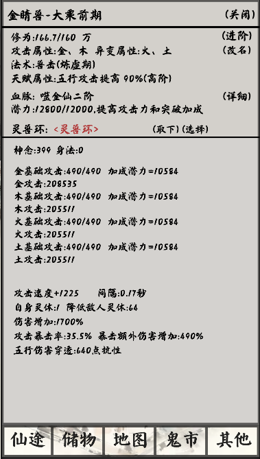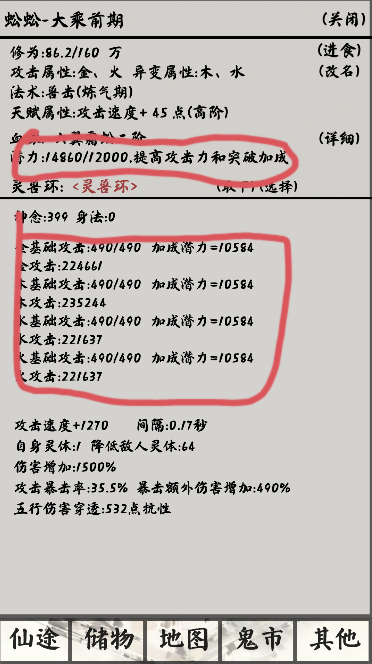 吞噬一只灵兽加60潜力,满200只需要两只,但是刚抓的攻击加成太低,这时候最低喂养需要到1300潜力值,也就是吞噬20只普通灵兽,这样进阶炼气攻击加成就能达到70/70
