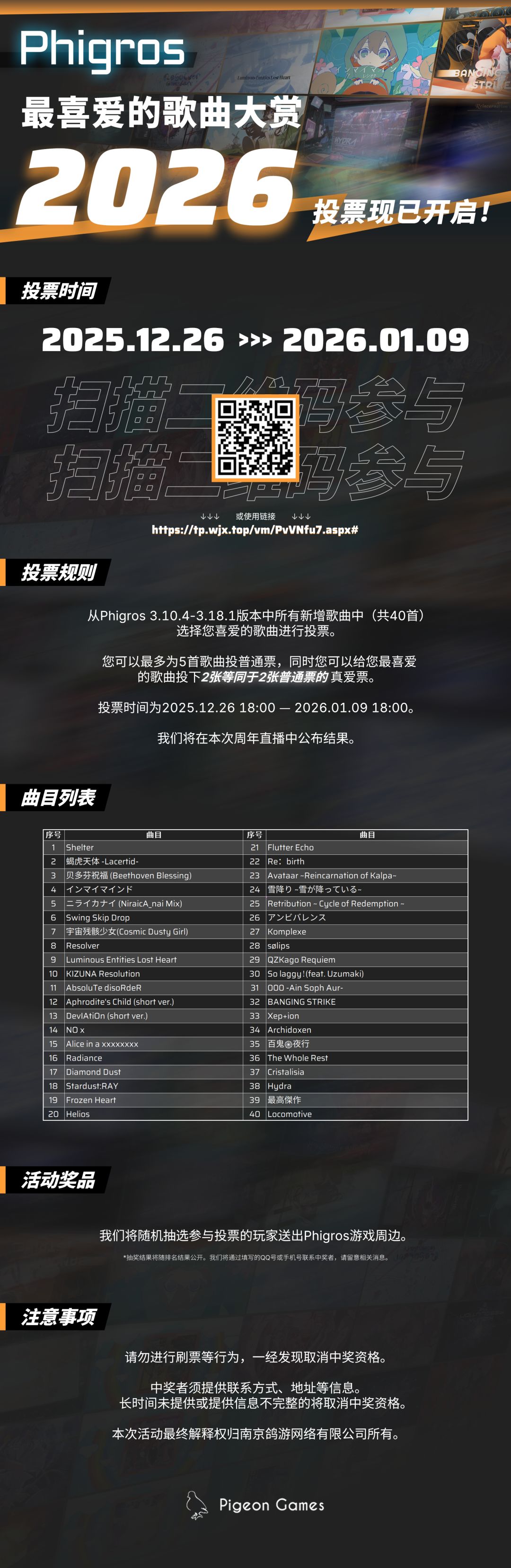 咕咕咕!2026“Phigros你最喜欢的歌曲投票”活动来了~参与就有机会赢取周边!快来为你喜欢的歌曲投票吧!详细请看下图——