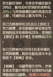 大家好,本周继续分享僚属之间的技能对比。本篇介绍房玄龄和唐玄奘的技能差别以供玩家在阵容上做出合适的选择。(一)破甲能力房玄龄:主动技“玄机破妄”可100%概率对全场目标施加破甲效果,持续10秒,破甲覆盖范围广且稳定。唐玄奘:依赖普攻触发小范围破甲,无主动破甲技能,破甲效果相对较弱。
