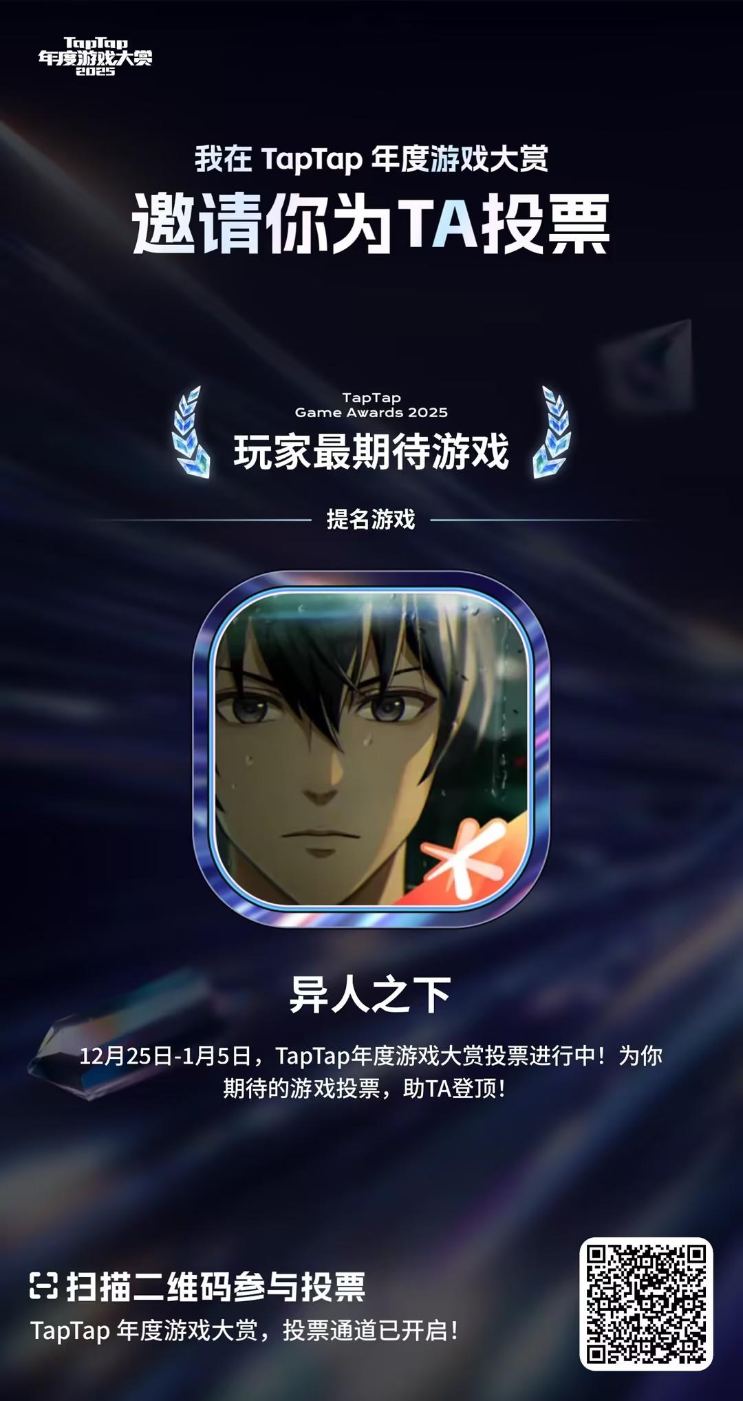 《异人之下》成功入围了 #2025TapTap年度游戏大赏 「玩家最期待游戏」奖项的评选,感谢TapTap平台以及大家一直以来对我们的关注和支持!