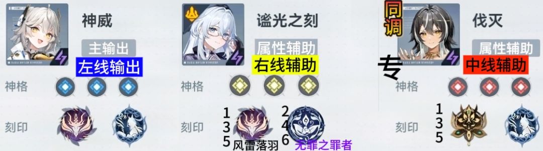 - Tips:1. 狂暴词条数视配队浮动,雷配队+会心率挺多。部分全队会心率:同调S伽梨中线专刻印15+6+8=29。 S霍中线10, 右线专变化[8~20],S霍奥义12。诗蔻蒂3专15/满25。陵光刻印3专15/满30。