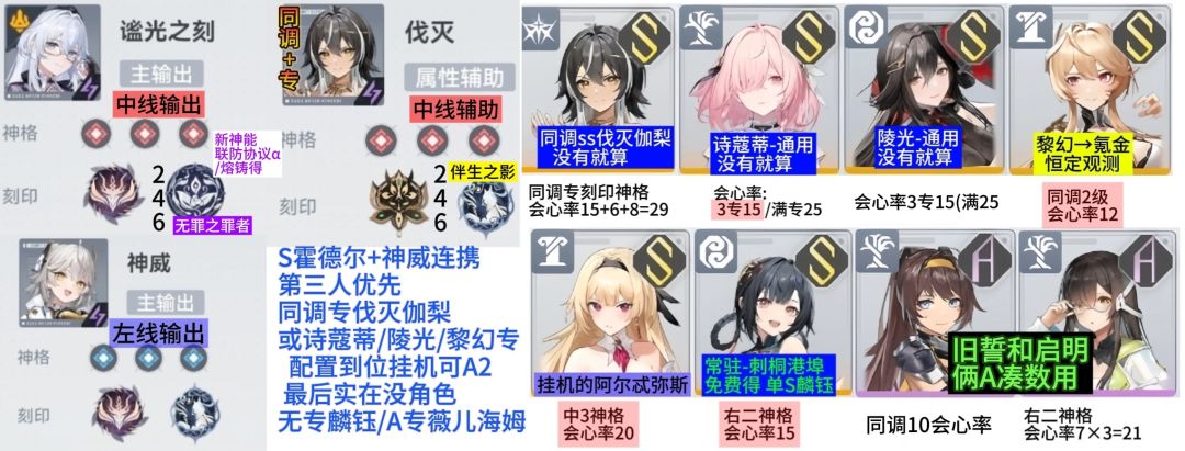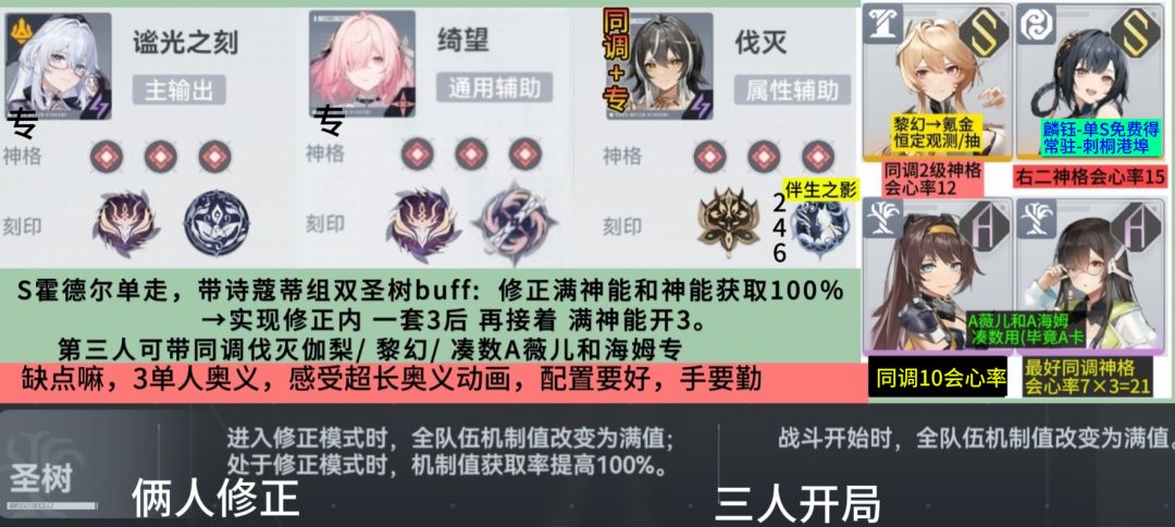 - 新连携S霍德尔替代绯染,双c神威输出没S霍高,这俩看你自己习惯手控哪个(S霍配置高走输出), 第三人优先带同调S伽梨,若无伐灭就带陵光/旧誓等护盾(保神威部分本不至于灰头像)。S霍和神威无专也能过普通本。不过养雷队多输出要高投入,毕竟3角色和模块带