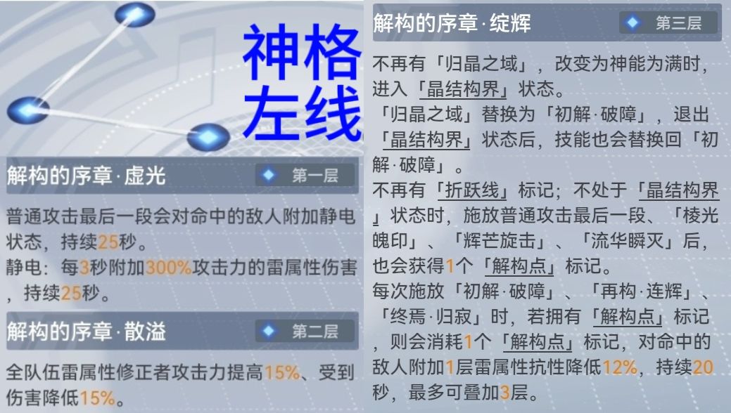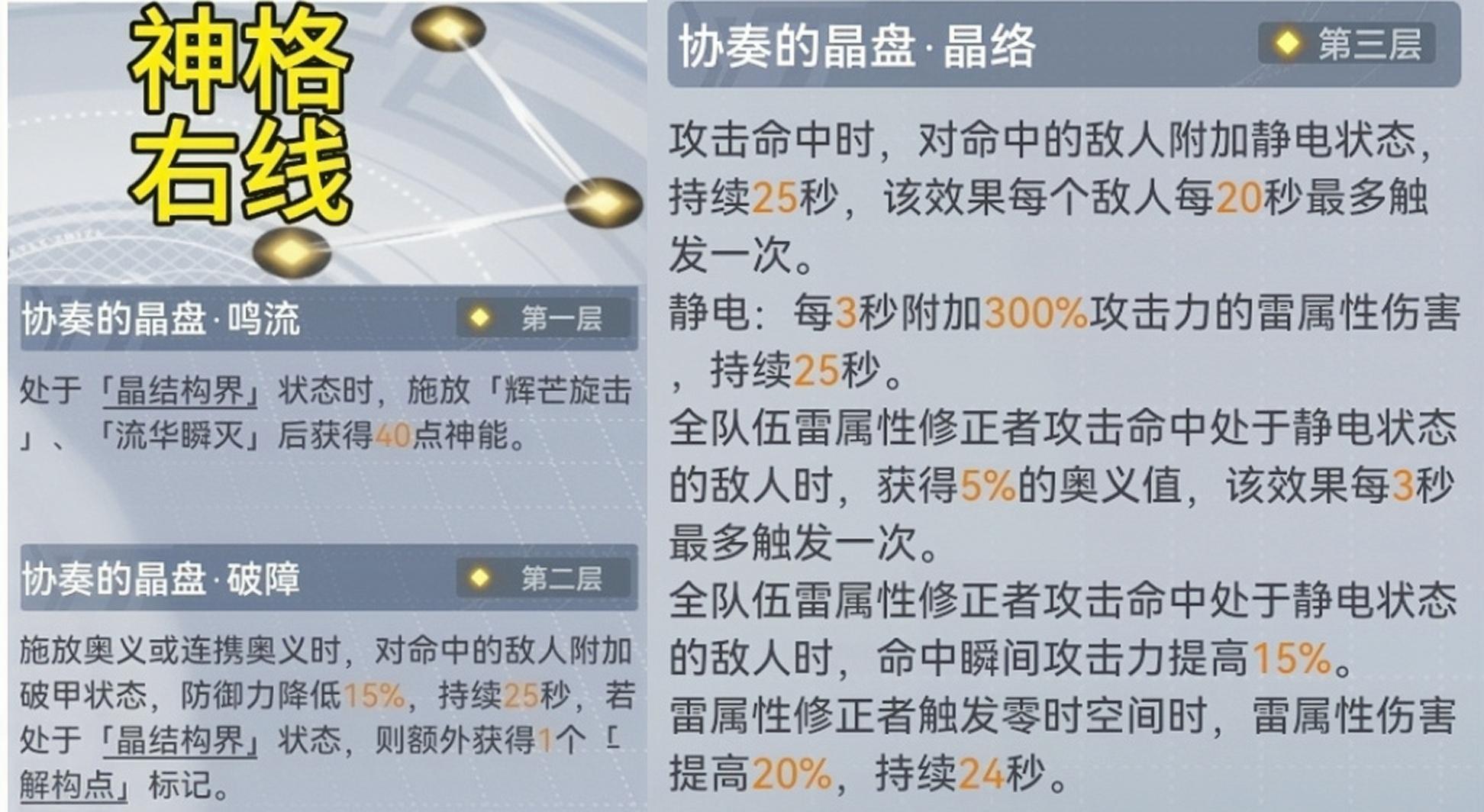 - 神格右线[晶盘]+全队雷会心率,伤害上升各8%(+2%/阶[1专8➭3专12➭5专16➭7专20]