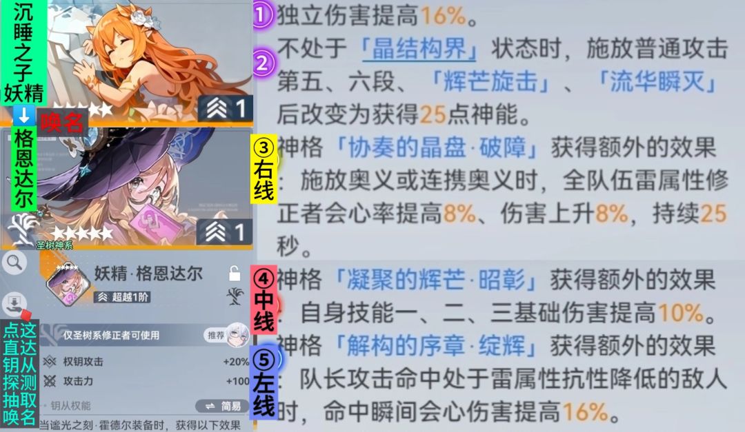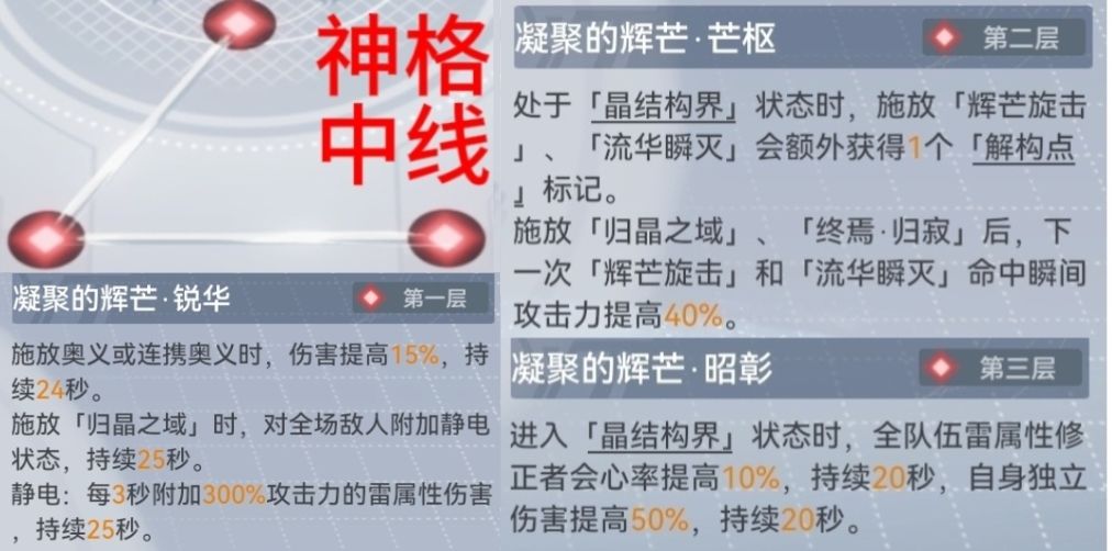 通用①②提高自身输出和加快常态神能获取优化循环。③④⑤神格对应加输出或辅助。④中线进一步加强自身输出。 ③右线辅助, 提供雷会心率和伤害上升。有专获取神能加快循环,没资源暂用通用也行。升阶还行.