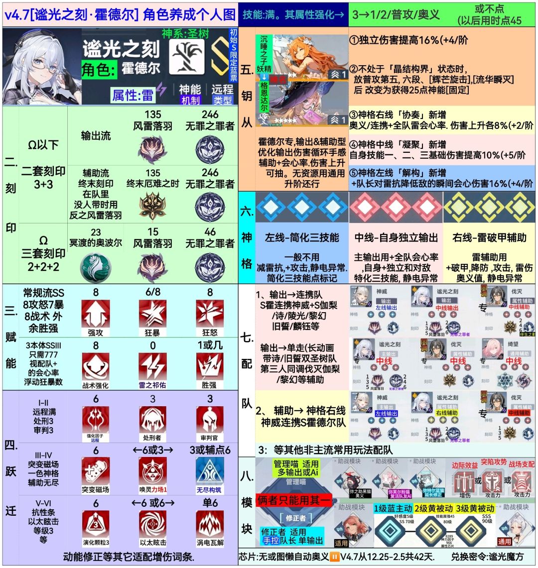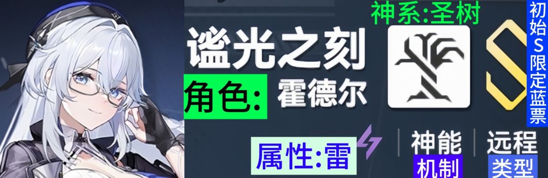 - 4.7谧光之刻·霍德尔作为S级雷系角色登场。作为辅助提供全队攻击、破甲降防、静电异常、会心率、伤害上升、雷伤、奥义值。但不提供抗打断能力和护盾等。单S辅助不如去年免费的Sss伐灭伽梨同调专(同调后雷辅.