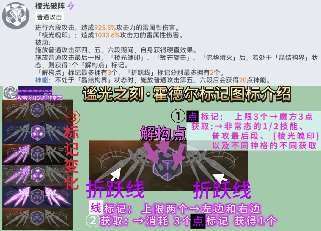 普攻6段,其中4/5/6有硬直, 常态第5和6段各+20神能.普A最后段/强普[棱光魄印]/1/2技能+ 1个点标记。[点标记上限3个, 线标记上限2个]。 [3个点标记转化1个线标记]。 其中,前4段可以闪避+ 普攻。A第6段要放完整响指才+神能