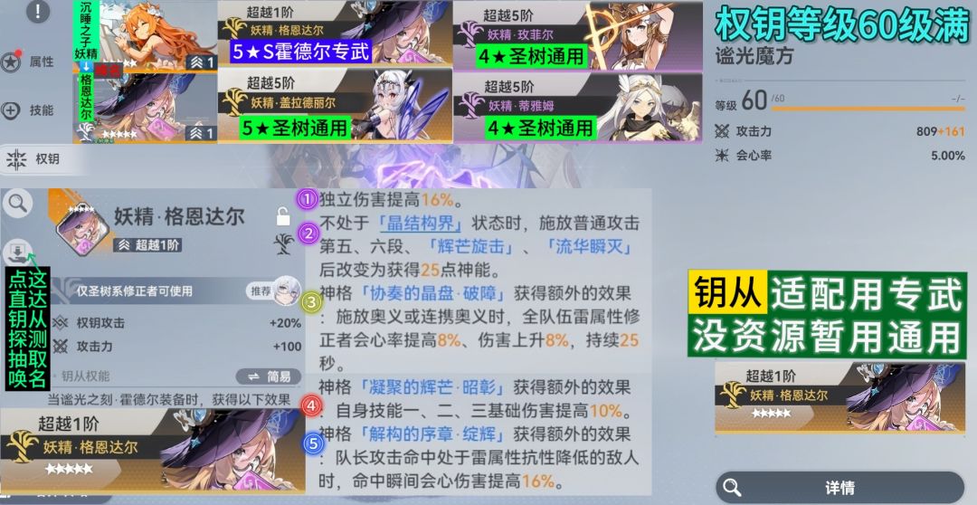 - 钥从探测池不限时抽圣树神系[沉睡之子]➡️唤名S霍德尔专[圣树妖精·格恩达尔](专武加快神能启动和提高自身伤害,辅助+会心率伤害上升,会心伤害等,可抽1把。➡️无资源暂用通用. 无专也能过迭代.