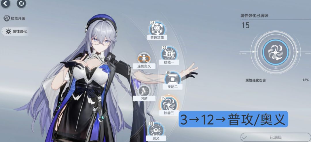 ⑵技能属性强化: 优先3→2/1→普攻/奥义