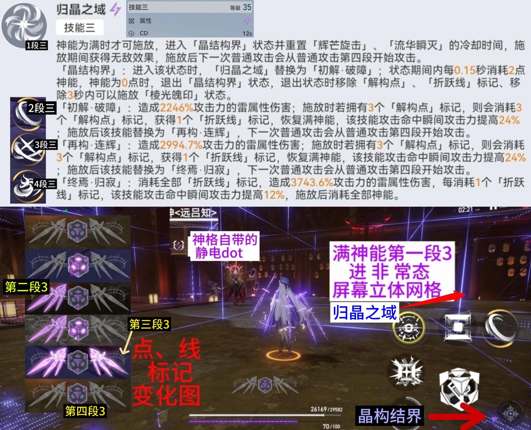 - 三技能整体人物表现S霍背后带剑翼。首段分两个:①是[归晶之域]立体网格空间,其效果→放时无敌、重置1和2技能CD、进[晶结构界]状态、普攻A4段开始。➡️②是[晶结构界]状态(屏幕底下左右点斜阵样式),其效果替换第二段3技能,期间内持续消耗神能,0则退出, 并移除全部[点线]标记。➡️首段可以闪避取消后摇,第四段也可以闪避取消后摇。