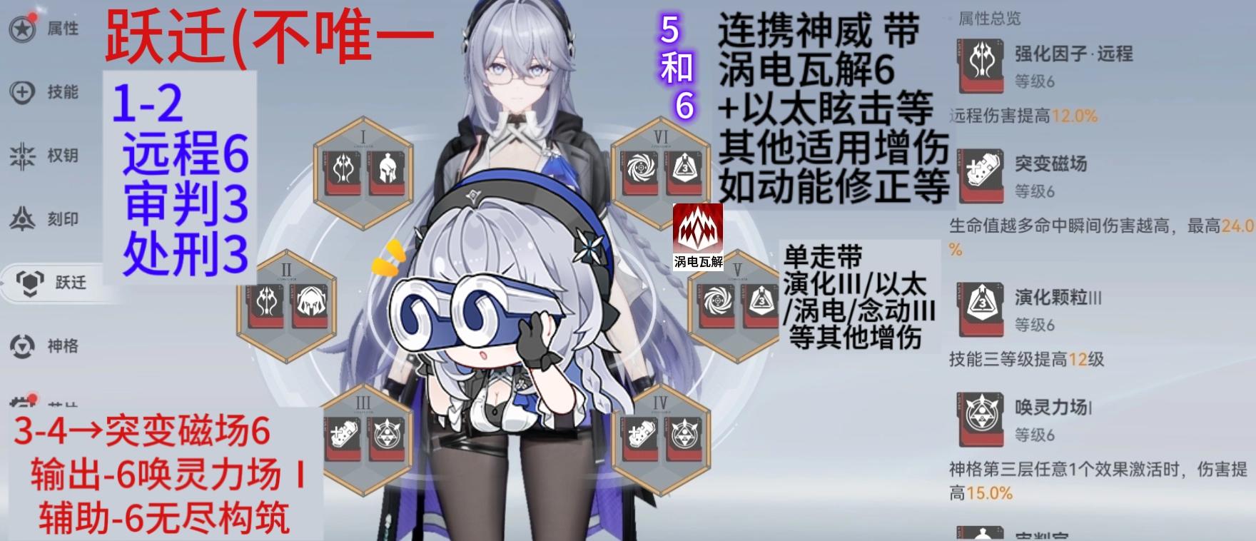 通用①②提高自身输出和加快常态神能获取优化循环。③④⑤神格对应加输出或辅助。④中线进一步加强自身输出。 ③右线用于高专辅助, 提供雷会心率和伤害上升。有专循环快,没资源没专暂用通用也行。升阶还行
