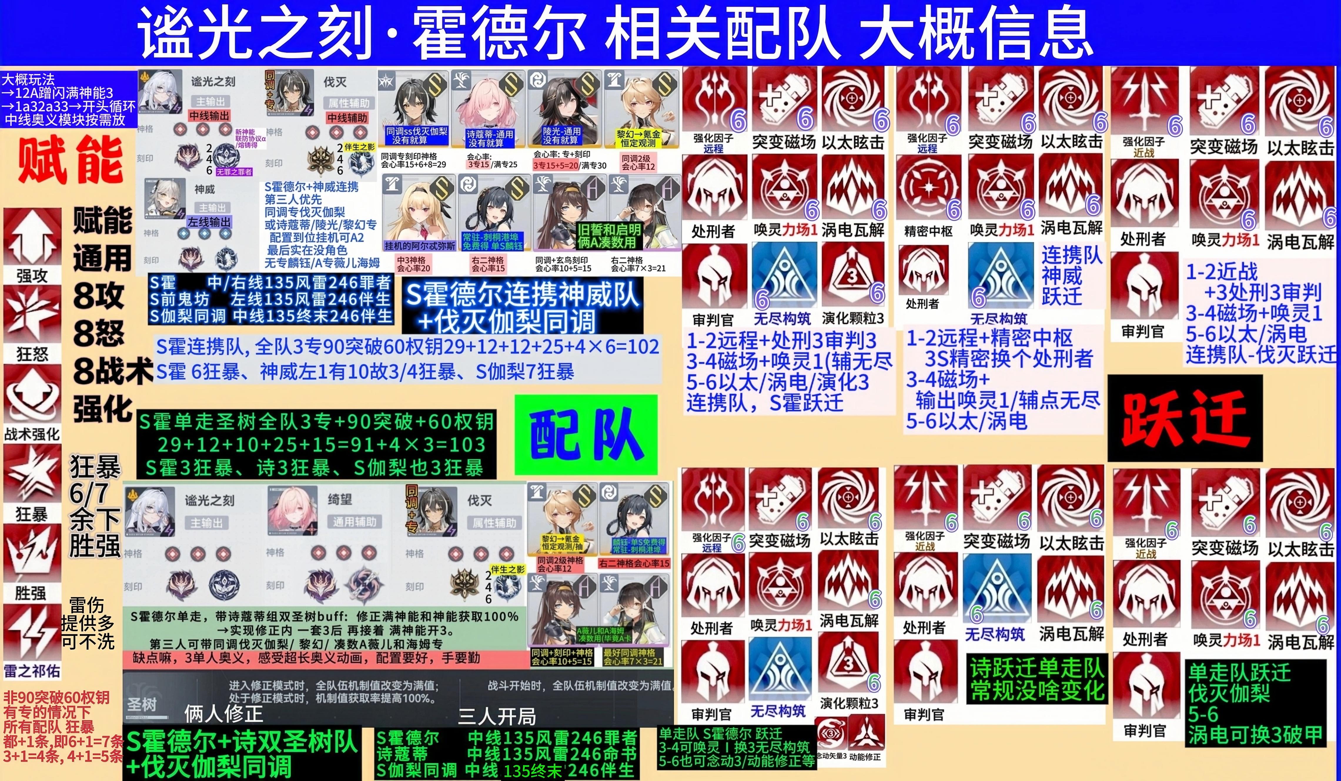 - ●词条:8强攻8狂怒6/7狂暴→8战术强化→余下胜强/雷之祁佑(狂暴视配队按需调。突破90级60权钥S霍德尔中线+神威左线+同调专伐灭伽梨中线→非Ω的S霍德尔会心率:[25+10+12]+29+[4×6]=百.嫌麻烦无资源突破90,非60权钥直接7/8狂暴