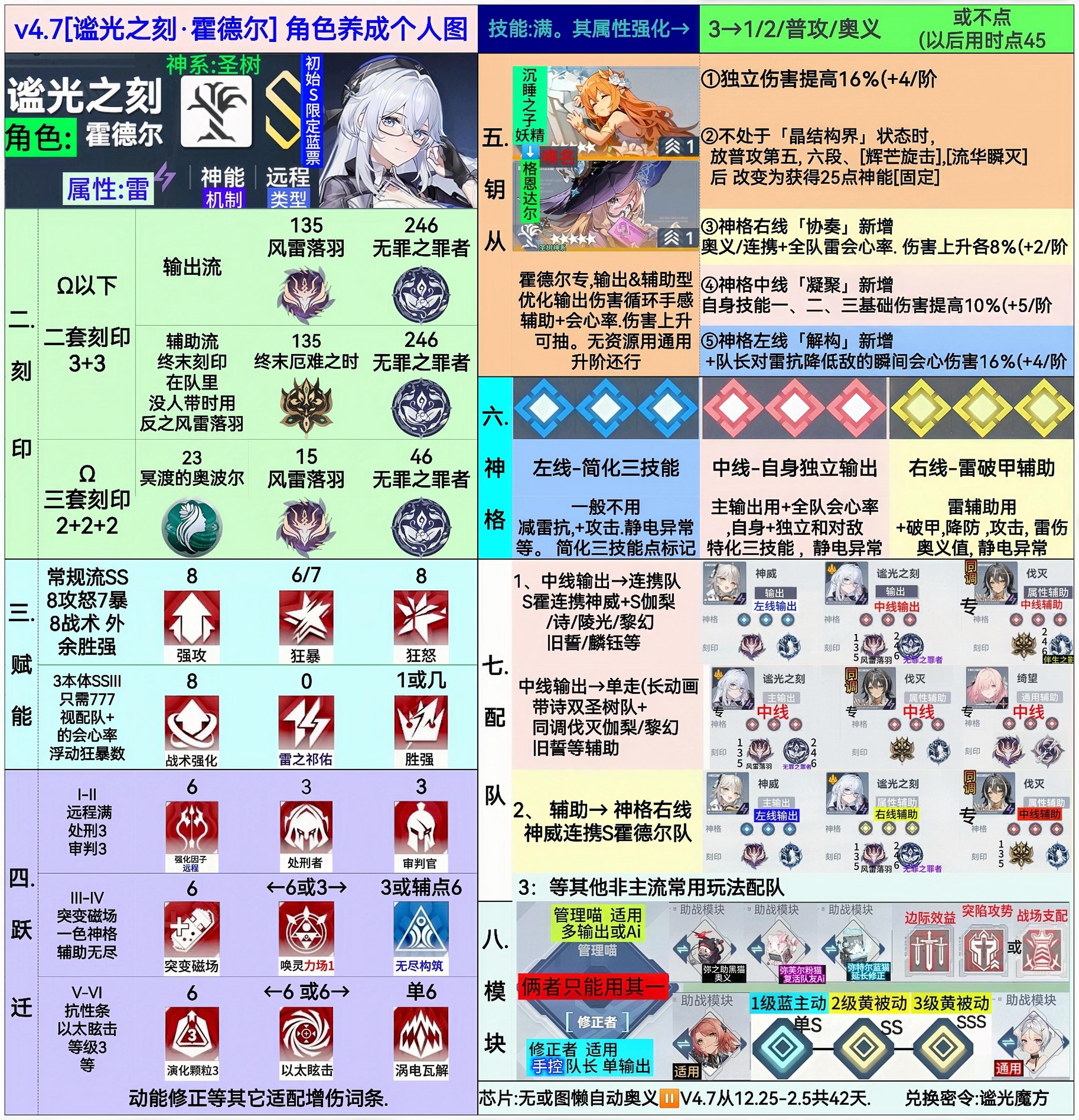 - 4.7谧光之刻·霍德尔作为S级雷系角色登场。作为辅助提供全队攻击、破甲降防、静电异常、会心率、伤害上升、雷伤、奥义值。但不提供抗打断能力和护盾等。单S辅助不如去年免费得Sss伐灭伽梨同调专(同调后雷辅.