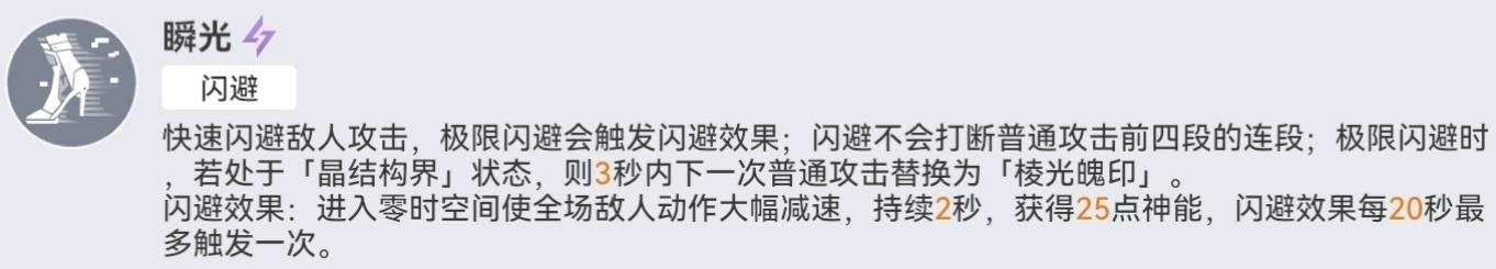 常规闪避中多效果闪避。除了常规零时空间外,有①普通闪避不断前4a连段数。②极限闪避+25点神能.③非常态下闪避3秒内普攻替换强普[棱光魄印].善用闪避衔接普攻从而加快神能获取