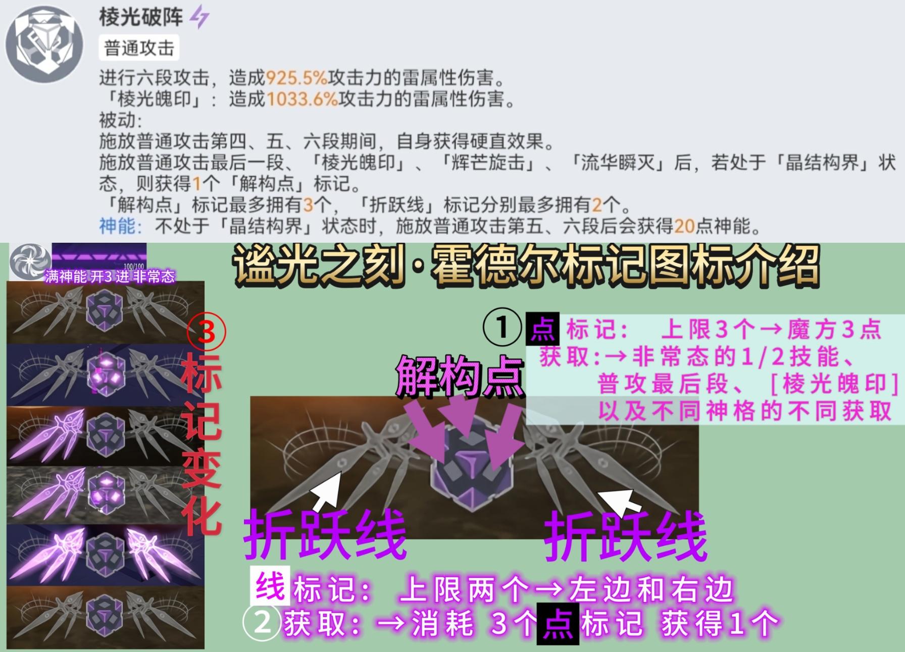 普攻6段,其中4/5/6有硬直, 常态第5和6段各+20神能.普A最后段/强普[棱光魄印]/1/2技能+ 1个点标记.点标记上限3个, 线标记上限2个。3个点标记转化1个线标记。 其中注意A第6段要放完整响指才+神能