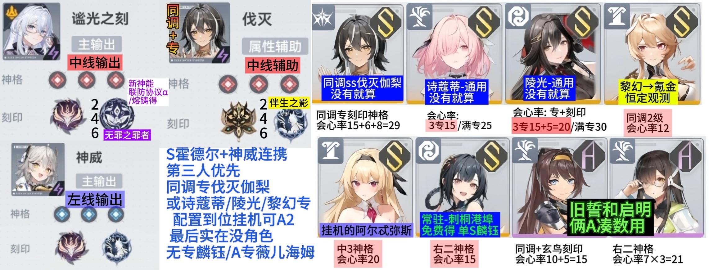 - s霍右线辅助神威,俩人抗打断能力差,安逸就带同调伐灭伽梨(同调后比诗要好),没有伐灭,第三人用有的辅助诗陵光/黎幻/旧誓,最后实在没角色用麟钰右线(刺桐港埠免费得