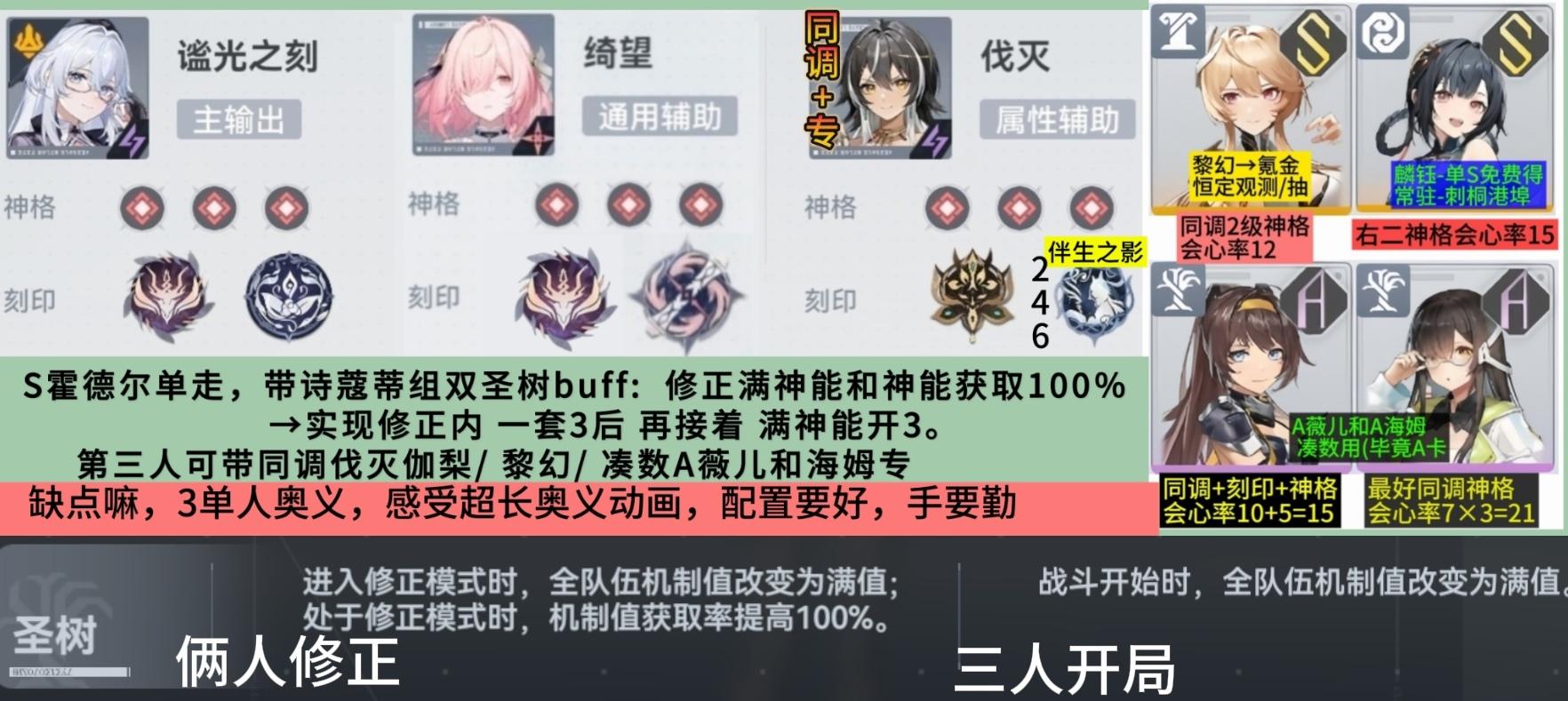 - 本期up组成新雷队(S霍+神威+伐灭/诗黎幻➡️对于无雷队可抽取霍德尔连携神威,也可氪金绯染连携神威,第三人S伽梨/其他你有的辅助. 但S霍德尔上位替代了绯染(单S比Ss绯染要好)。➡️S霍德尔单走,带诗蔻蒂+S伽梨/黎幻等辅助也行(多重单人奥义动画折磨。单走带个圣树角色→圣树buff进修正满机制和+快机制获取→实现1次完整3+第二套开3。⏸雷队专武: 单S霍德尔1专, 神威单S用5星真樱通用(2S以上换专武, 7阶通用和3阶专武相差不大),第三人同调伐灭专/诗/陵光/黎幻/旧誓/麟钰