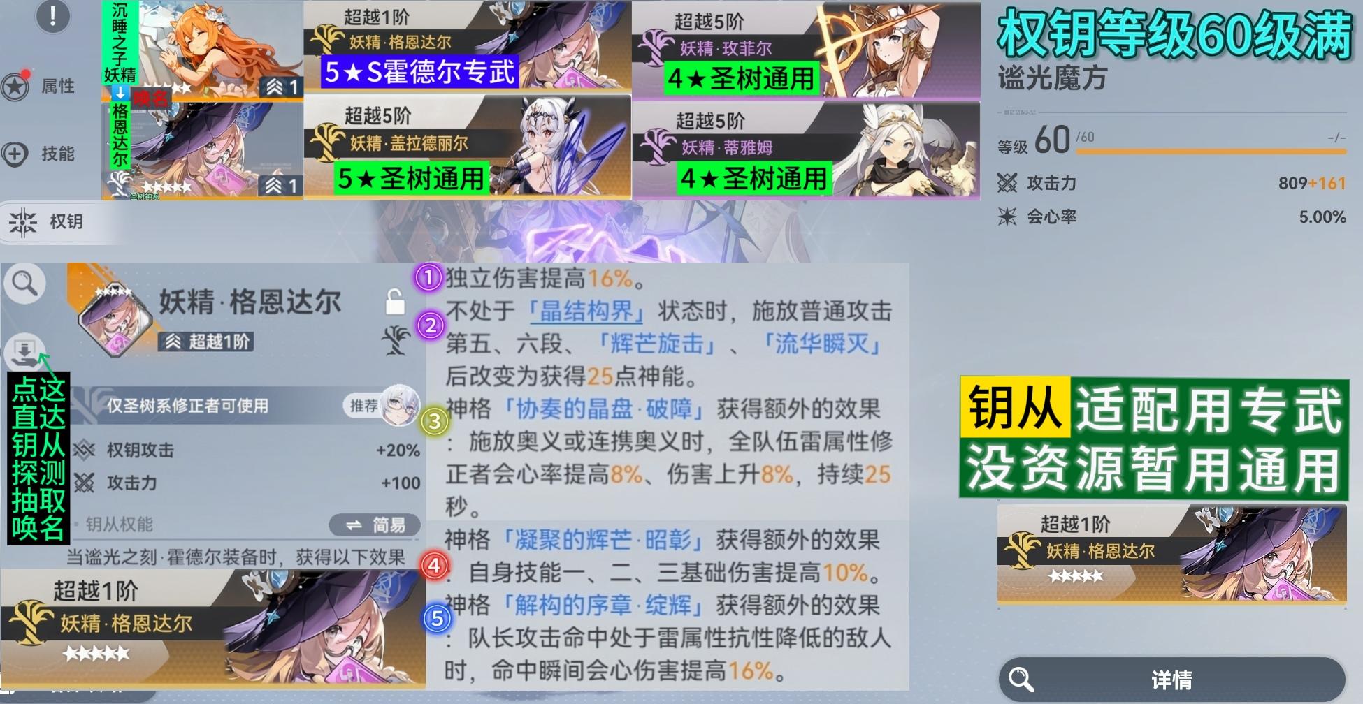 - 钥从探测池不限时抽圣树神系[沉睡之子]➡️唤名S霍德尔专[圣树妖精·格恩达尔](专武加快神能启动和提高自身伤害,辅助时+会心率伤害上升,会心伤害等,有需求抽1把,没需求➡️无资源暂用5/4星圣树通用. 无专也能过迭代