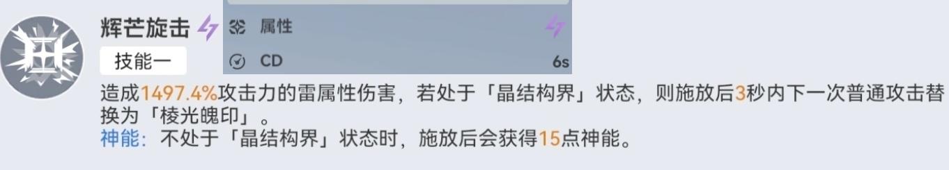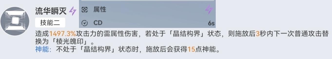 - 不处于[晶构结界](非常态)状态时, 放普攻第五、六段、[辉芒旋击1技能]、[流华瞬灭2技能]后改变为获得25点神能。 [固定]