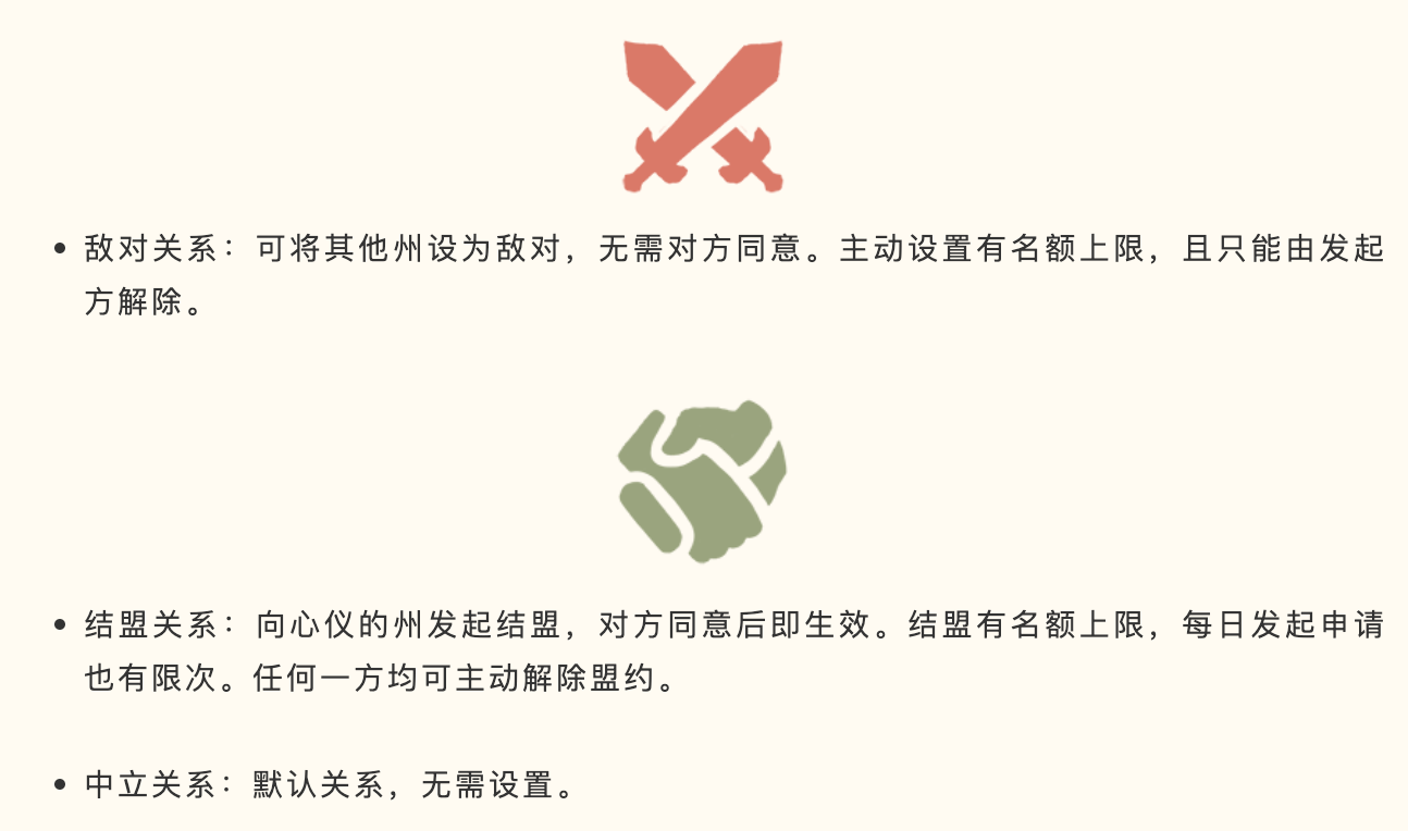 伴随着史话赛季随机合区的回归,一个全新的“州外交”功能也同步上线。这不仅仅是一个简单的社交标签,更能干预合区结果。在系统进行随机匹配的算法中,会参考各州提前设置好的外交关系。简单来说,这个功能给了各州管理层一个“许愿”的机会,虽然不能百分百决定结果,但能显著影响遇到盟友或避开死敌的概率。