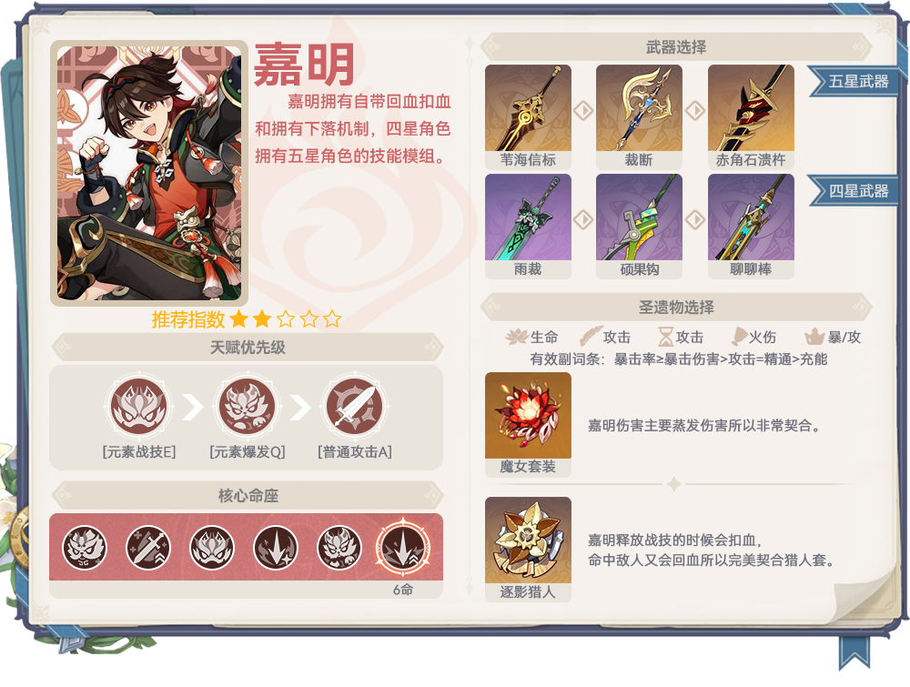 虽然嘉明的强度不错,但毕竟只是一个四星主C角色,因此不是XP玩家,不推荐特意去补命座