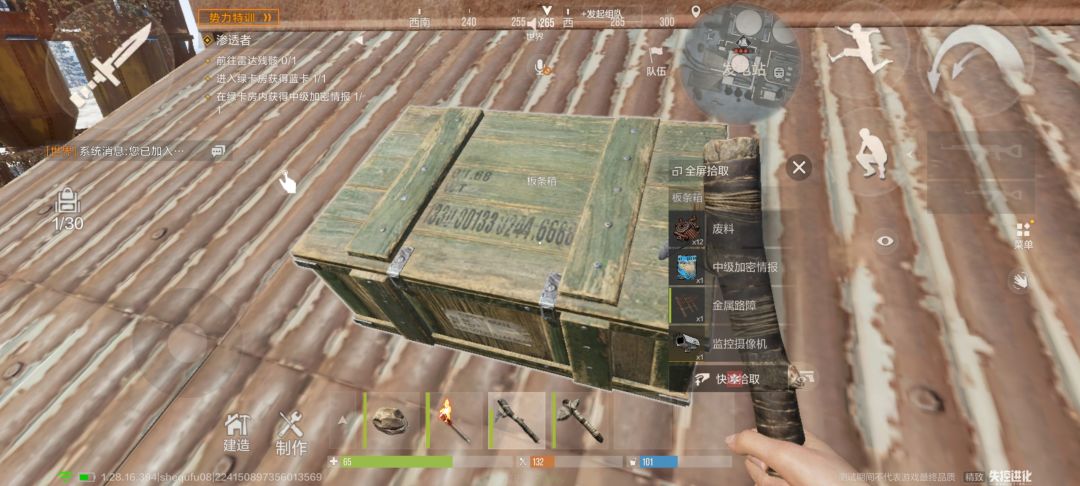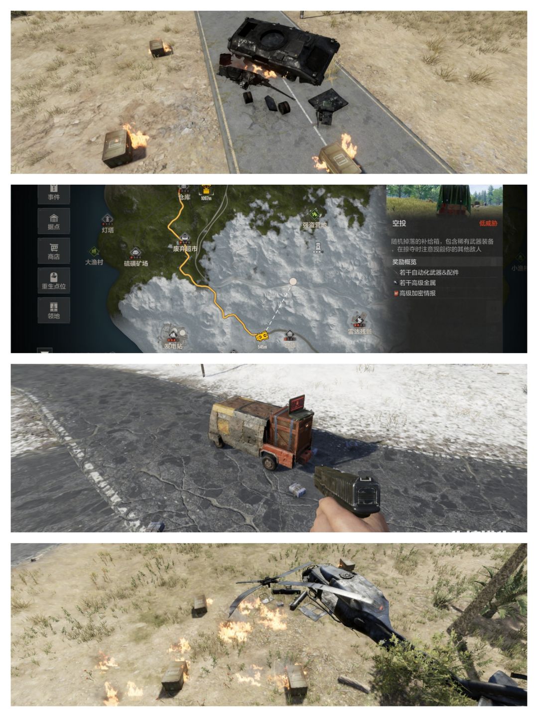 在跑图过程中可以在马路两边进行寻找废弃物资点。在此处可以搜刮铁桶、木箱、油桶、工具箱等。击碎后会获取废料、分解物资、油、布等。