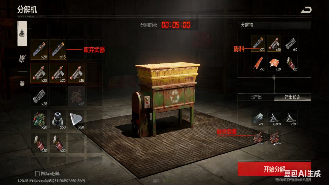 收集废弃武器、金属配件、罐头盒等杂物,放入分解机进行分解可获得大量废料。