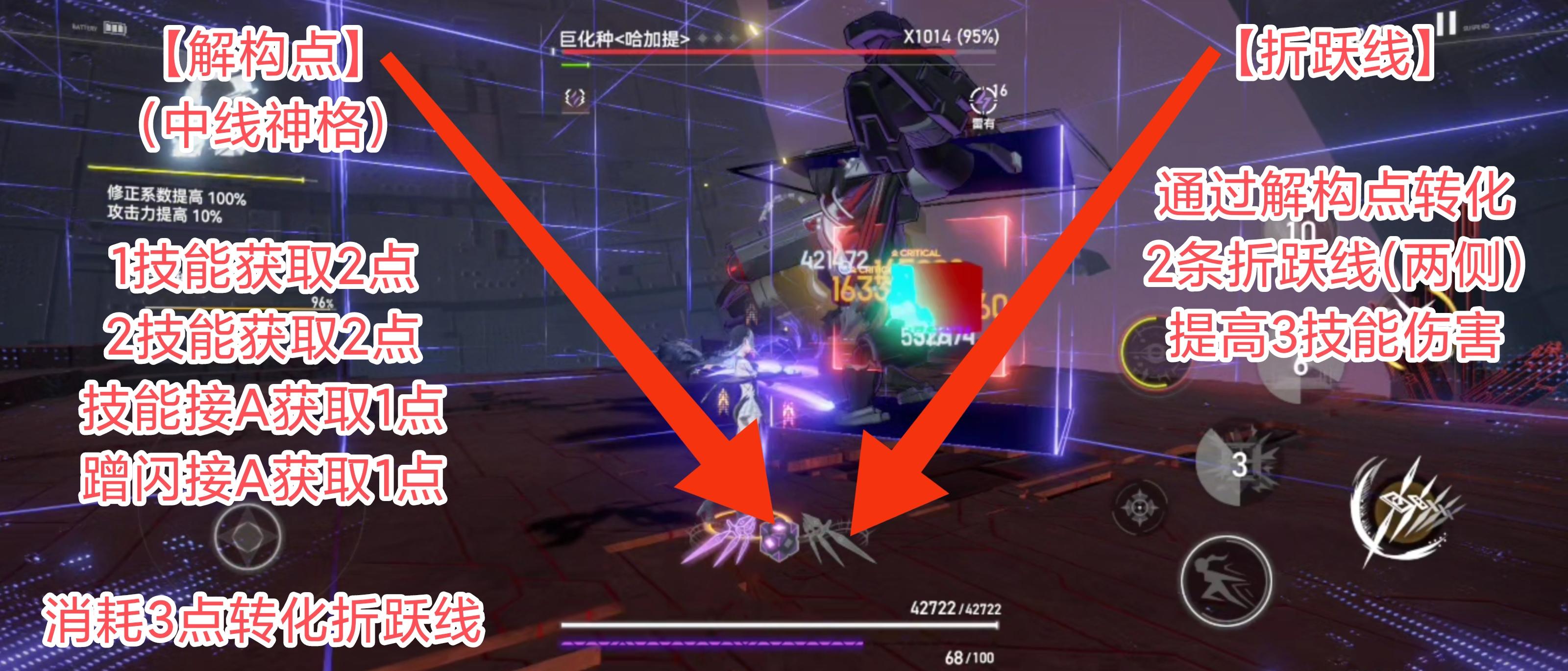 点击2技能加普攻,再打满三个“解构点”,然后点击3技能消耗“解构点”,转为右边“折跃线”标记,此时释放3技能的最后一段,消耗两边“折跃线”进行收尾。