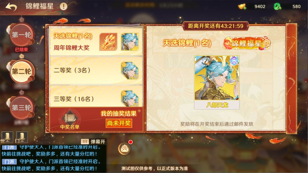 开奖时,依次按照三等奖、二等奖、锦鲤大奖的顺序开奖。未获得上述奖励的守护使也可获得参与奖。获得周年锦鲤大奖的天选锦鲤,将可以入手完整神魔金将八部天龙*1和特别称号锦鲤福星,大家可别忘了上线参与哦~