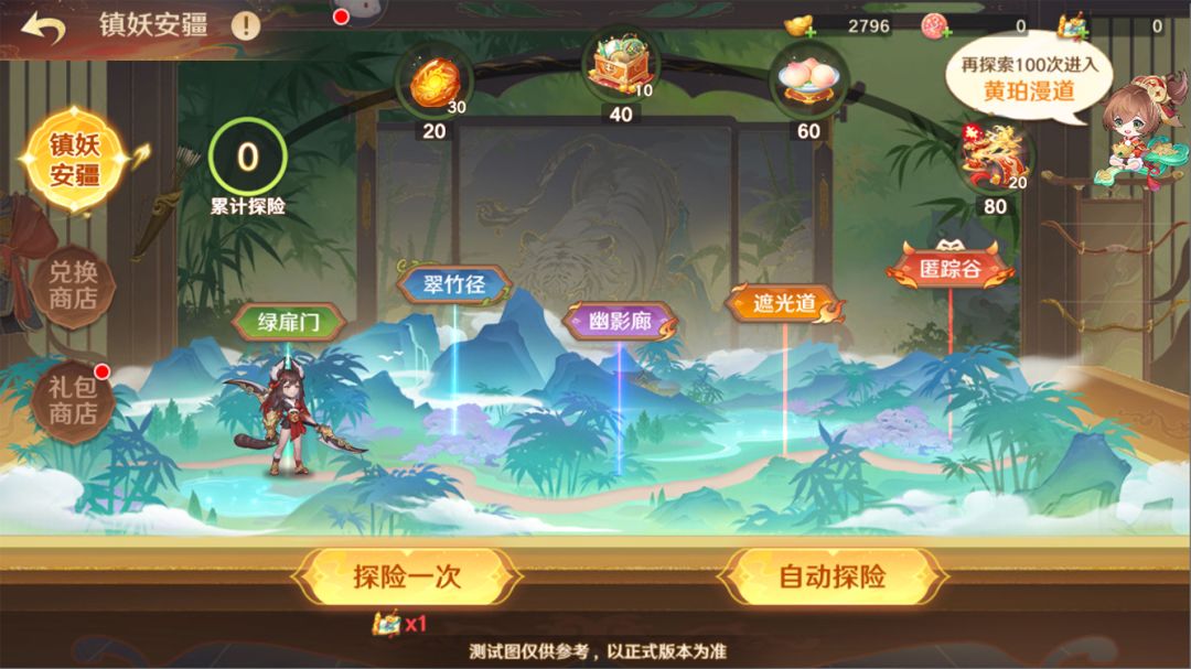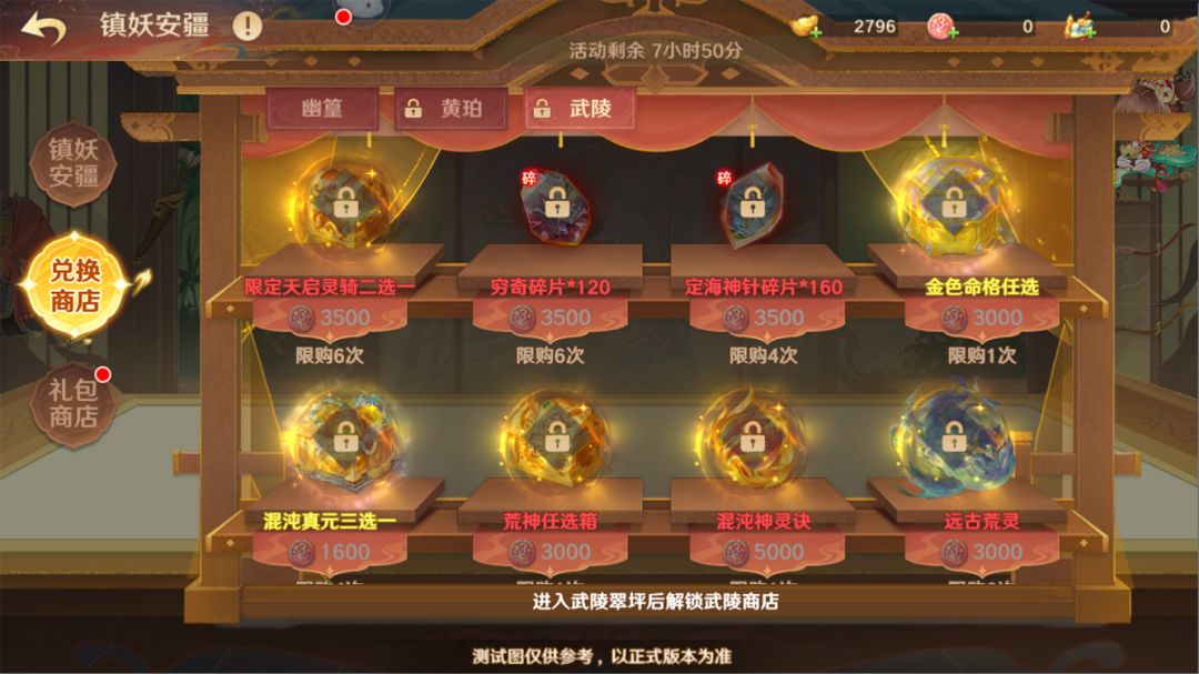 活动期间,守护使可使用活动道具「镇妖图」进行探险镇妖,镇妖达到一定次数可获得道具奖励,累积探险次数还能逐步解锁兑换商店等级,使用镇妖获得的活动道具「三辰金器」,便可在商店中兑换神魂六选一、龙年金将碎片任选、剧场礼花、典藏玩偶任选等道具奖励。