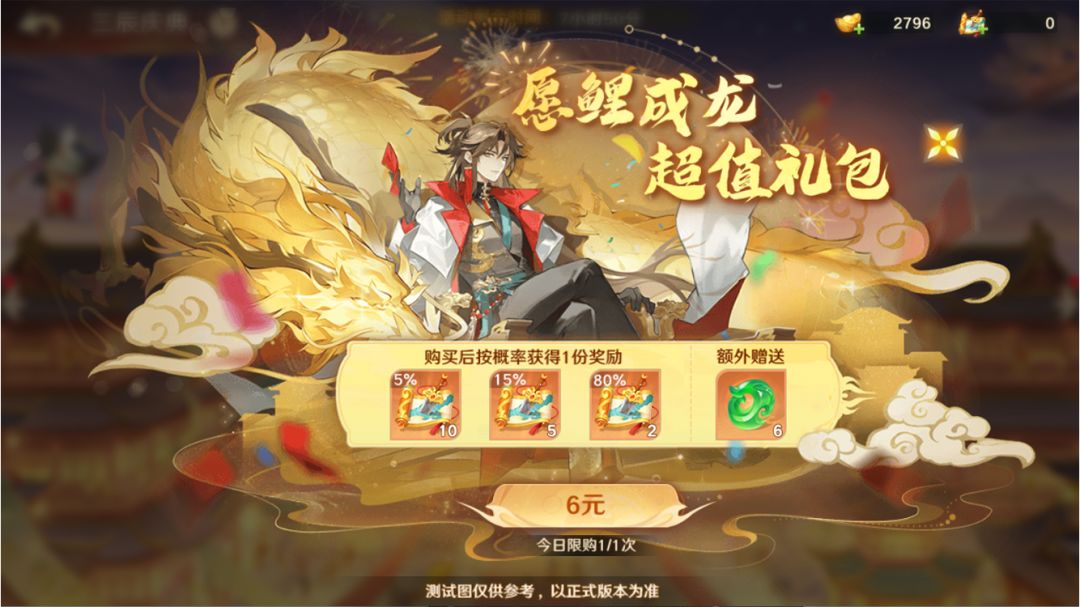 周年庆典福满盈,锦鲤礼包享不停~ 周年庆典期间,每日都将会以超低折扣价格限量售卖锦鲤礼包~购买礼包将概率获得一定数量的「镇妖图」,并附赠等额仙玉。