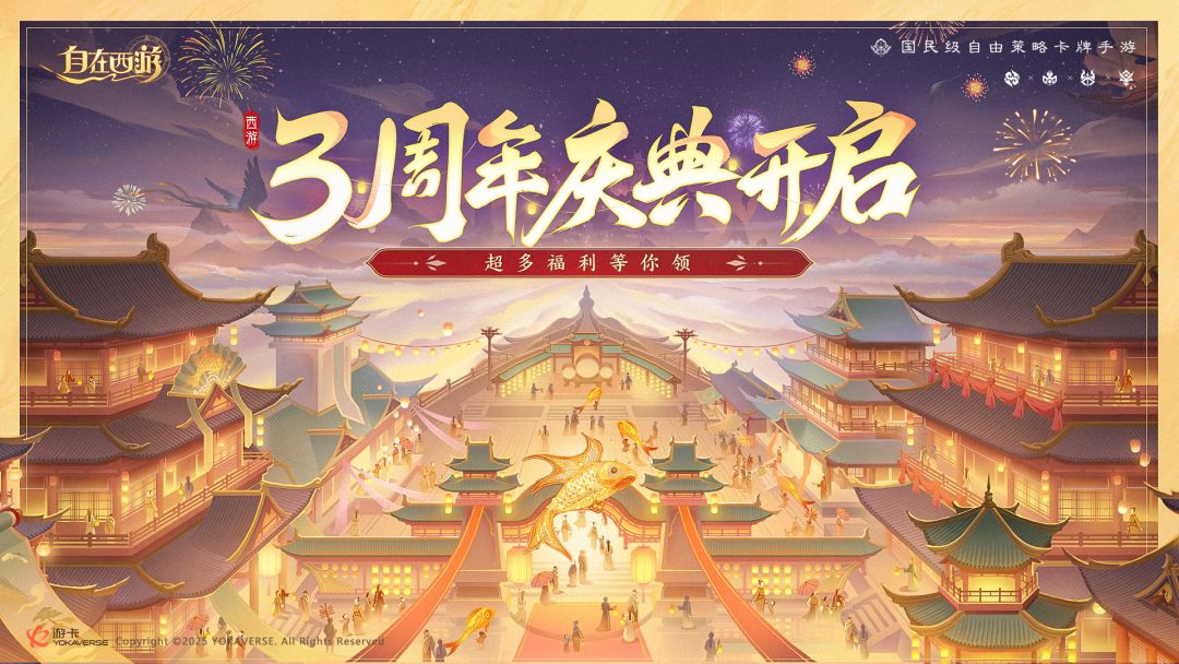守护使大人,自在西游三周年庆典活动即将在明日开启~首日即可获得三周年限定主城皮肤,还有神魂六选一、龙年金将碎片任选、剧场礼花……等你前来兑换,更多福利即将到达,快来准备与我们一同欢庆周年吧!