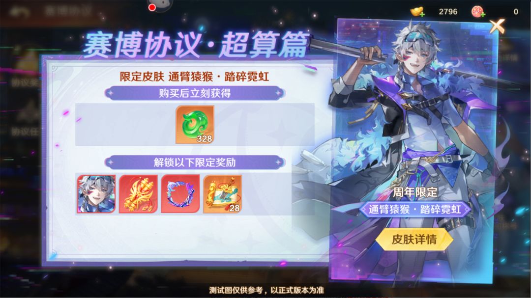 解锁超算篇的守护使大人在卷宗达到等级后可以获得通臂猿猴周年限定皮肤·踏碎霓虹、周年限定头像框·踏碎霓虹、周年限定称号·踏碎霓虹、镇妖图*28以及机核篇所有对应等级奖励。周年限定通臂猿猴皮肤·踏碎霓虹暂时只能通过解锁赛博协议·超算篇来获得,活动结束后短期内不会在珍宝阁中上架售卖,守护使大人不要错过赛博协议超算篇的购买时间哦~