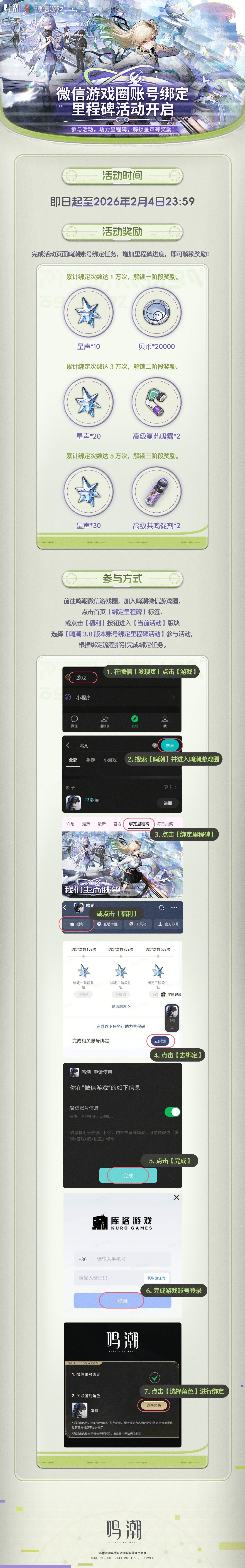 完成活动页面鸣潮账号绑定任务,增加里程碑进度,即可解锁奖励!