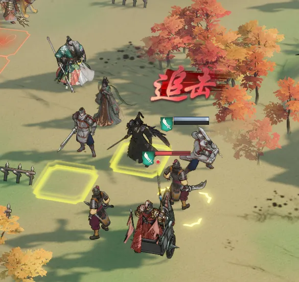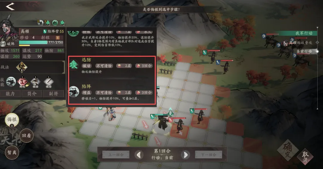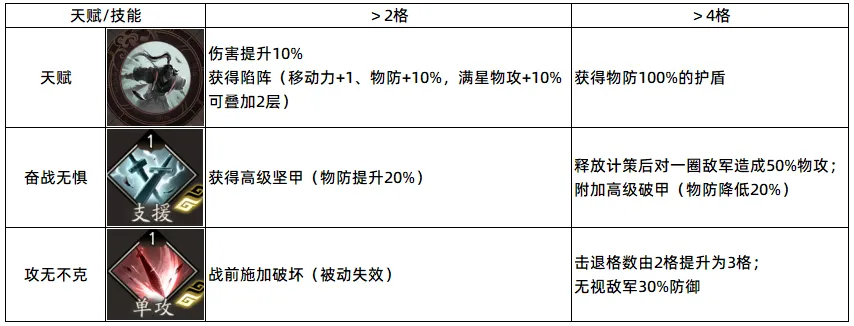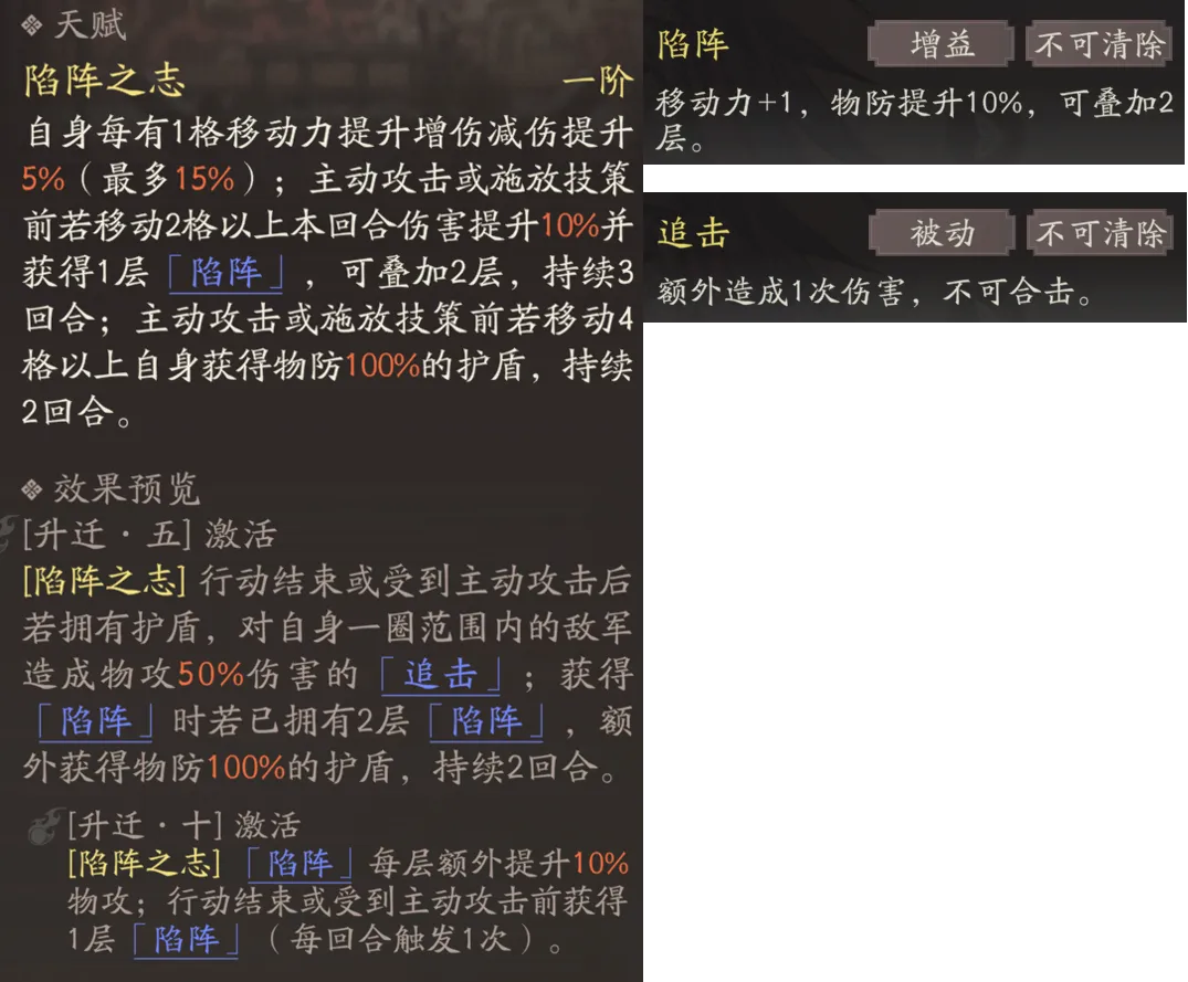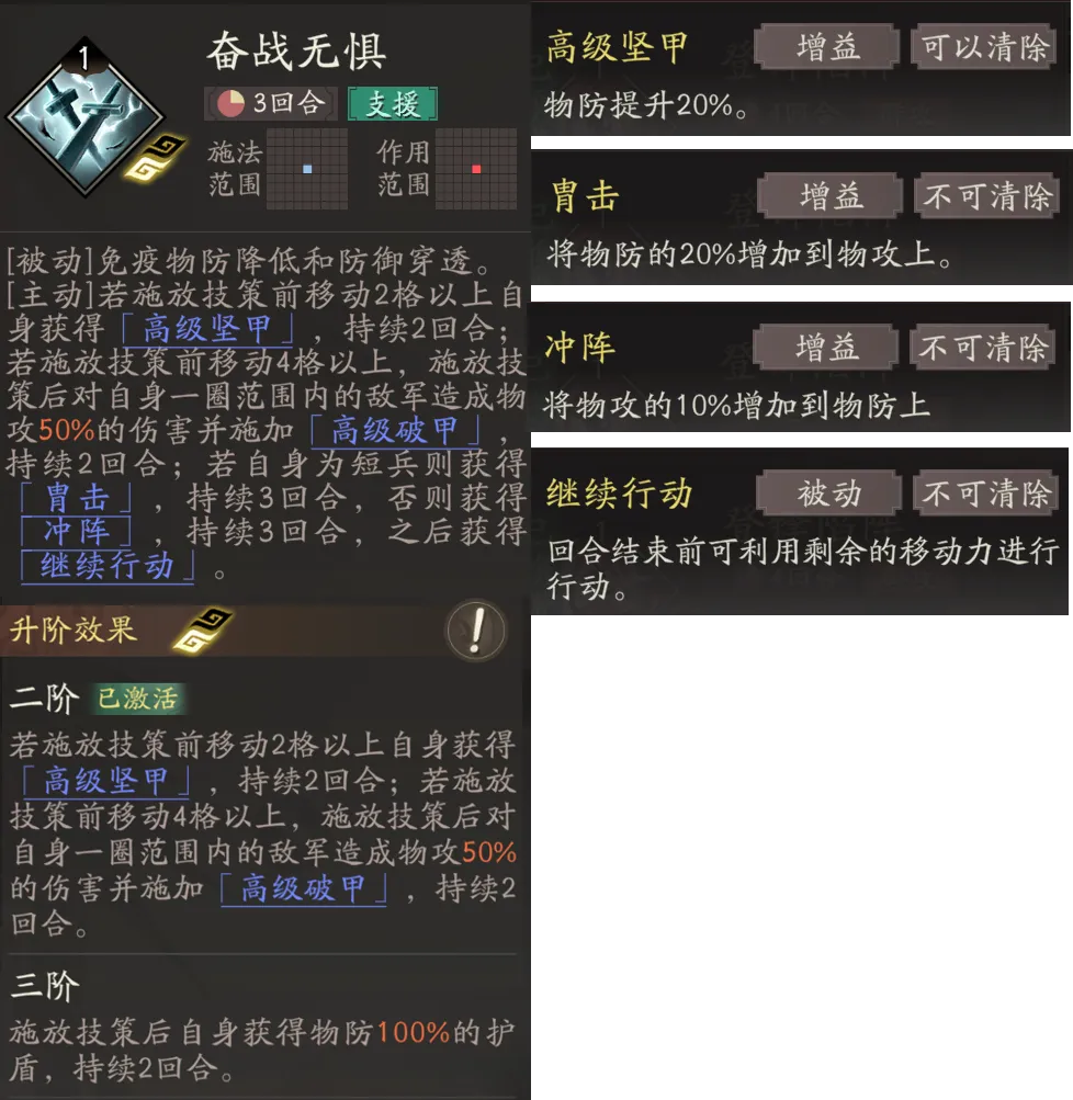 二阶在释放技能前,移动格数>2格,还能获得高级坚甲;移动>4格,可以追加伤害、给敌方附加高级破甲debuff。这里二阶的追加物攻效果、也是可以触发天赋获取陷阵层数并触发副将侯成效果、联动副将侯成天赋层数的获取。