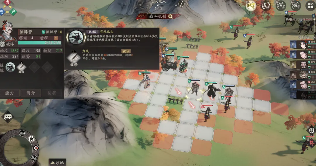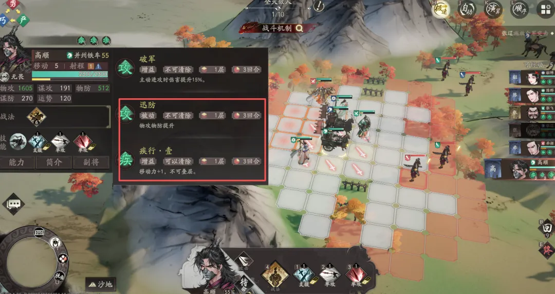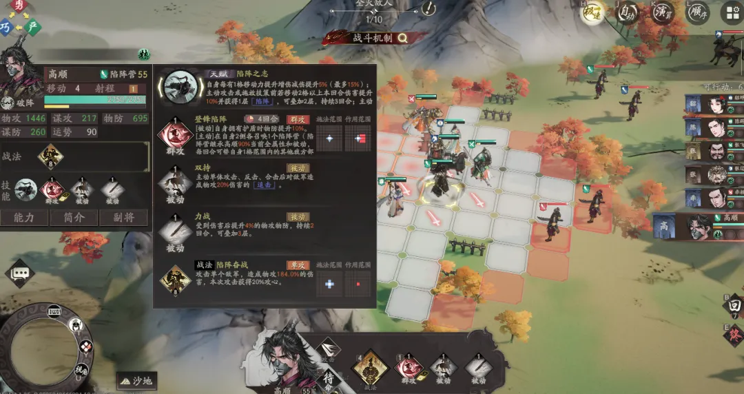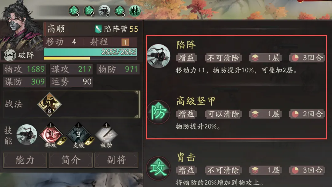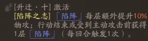 10阶让陷阵的获取更简单,行动结束或受到主动攻击前均可获得;另外就是每层陷阵能够额外提升高顺10%的物攻,配合部分技能的物攻、物防叠加机制,可以进一步提升高顺的攻防面板。
