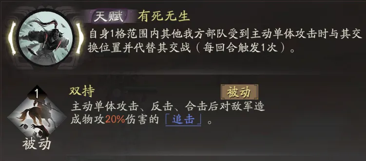 如下3张图,图1是高顺带了双持和力战两个被动;图2仅显示了力战;图3合击后依然有双持的追击效果。