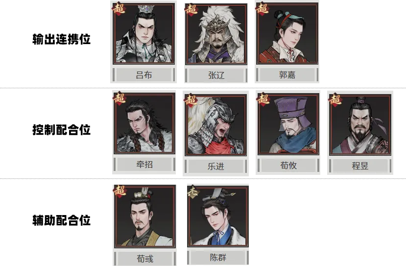 荀彧各种面板增益、减伤效果的附加,配合高顺的攻防相互叠加机制、护盾机制等,可以很好的辅助高顺提升生存和输出能力;陈群的两个特色技能:提升移动力的名门通亨、减技能CD的建制调令,都能很好的辅助高顺作战。