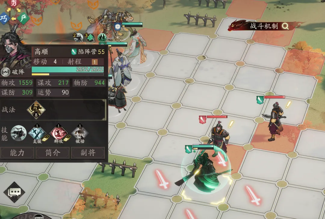 高顺天赋主要在主动攻击或释放计策前,移动>2格可以获得1层提升移动力、提升攻防(满星提升物攻)的陷阵效果。