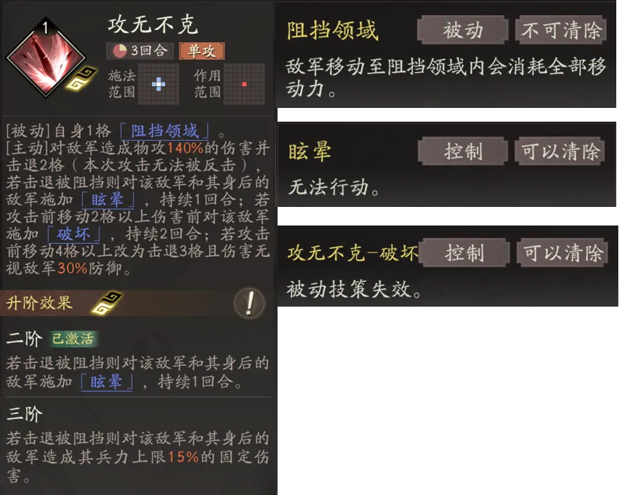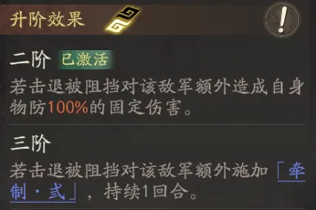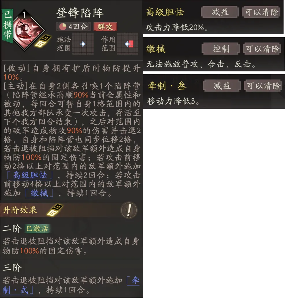 该技能升阶适当补充了高顺的输出和控制能力:2阶击退敌方被阻挡时可以追加固伤;3阶可以附加实用的减敌方3移动力的debuff。
