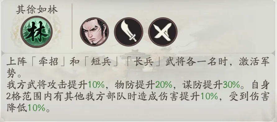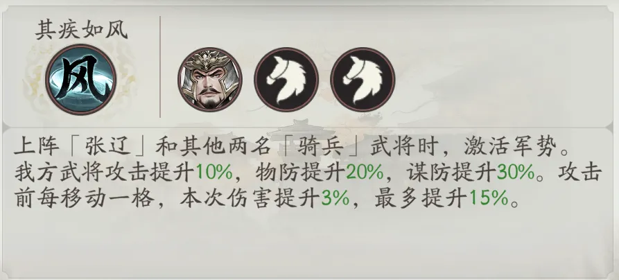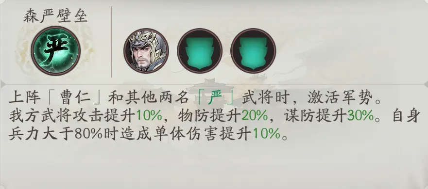 除此之外,绿色严属性的高顺,也可协助曹仁激活军势;步兵可协助牵诏激活军势;骑兵可协助张辽激活军势。