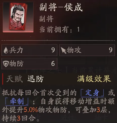 专属副将侯成,主要可以帮助高顺增加抵抗定身、牵制等限制移动debuff的能力,同时可以在自身获得移动增益是额外提升自身攻防。